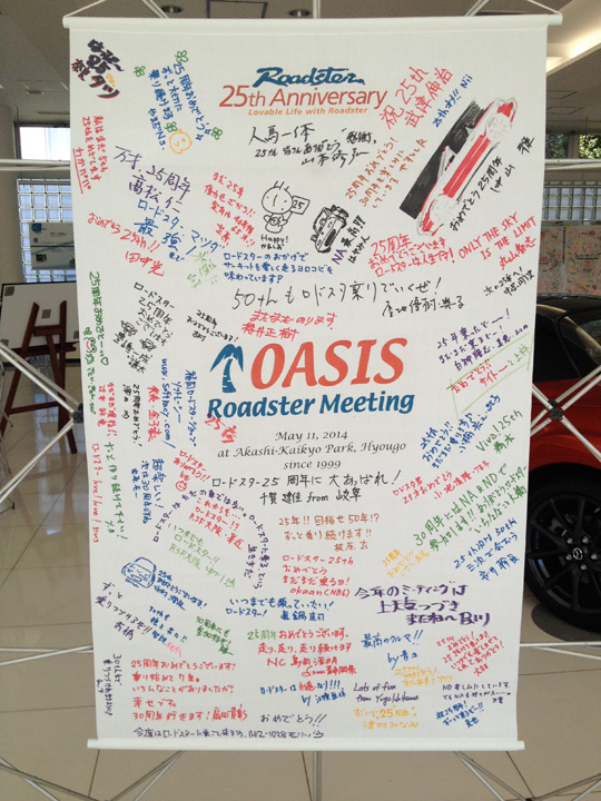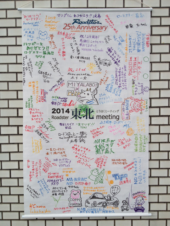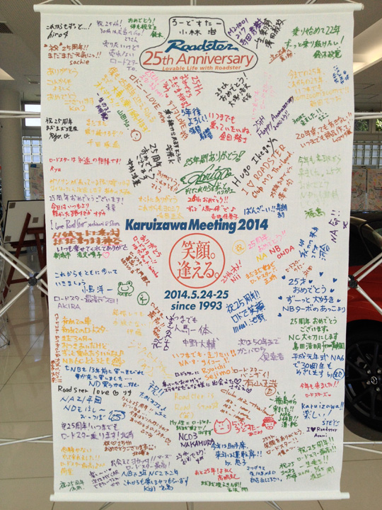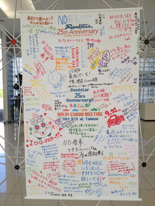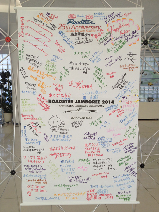 タペストリーに20周年を祝うひとことと名前を寄書きしました。各地での直筆の寄せ書きは、現在もマツダ横浜R&Dセンターで保存中の、20周年署名車のトランクに入っています。今年は、7月のRoadster展で虫干し?展示予定です。